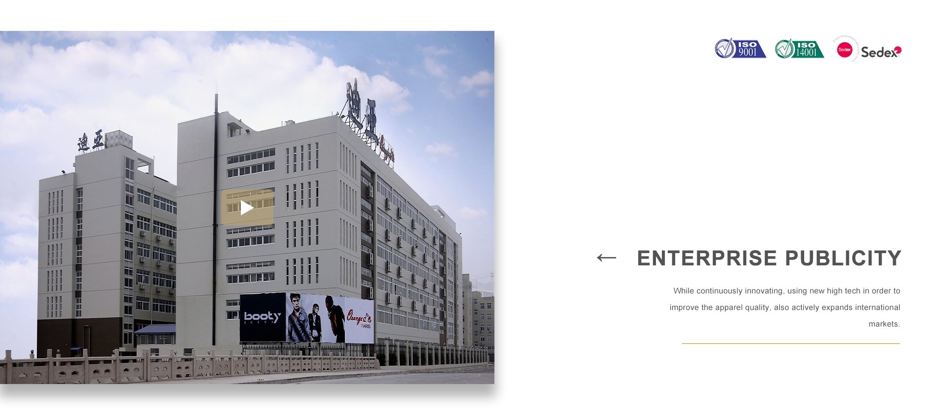 浙江迪亞服飾有限公司于1998年在世界時(shí)尚品牌之都——法國巴黎二區(qū)應(yīng)運(yùn)而生。同年,在浙江省甌海經(jīng)濟(jì)開發(fā)區(qū)東方南路28號設(shè)立服裝制造工廠。公司集服裝設(shè)計(jì)、生產(chǎn)、營銷、品牌于一體,在不斷創(chuàng)新、采用高新技術(shù)提高服飾質(zhì)量的同時(shí),積極拓展國際市場,海外營銷部長期與各大國際著名品牌保持非常緊密的合作關(guān)系。品牌建設(shè)是公司堅(jiān)持不懈的追求,我們每年都會積極參加國內(nèi)外舉辦的各大服裝展銷會。憑借著良好的質(zhì)量與信譽(yù),市場占有率在逐漸擴(kuò)大,產(chǎn)品遠(yuǎn)銷歐洲、美洲、亞洲等國。公司以生產(chǎn)棉衣、羽絨服、派克、大衣、夾克、運(yùn)動(dòng)休閑服飾等為主,旗下主打品牌有 ORANGE D’OR 和SASAEC,各品牌服飾均以典雅的色彩、優(yōu)美的線條、卓越的魅力吸引著都市麗人,將時(shí)尚、經(jīng)典的潮流信息予以淋漓盡致的演繹。